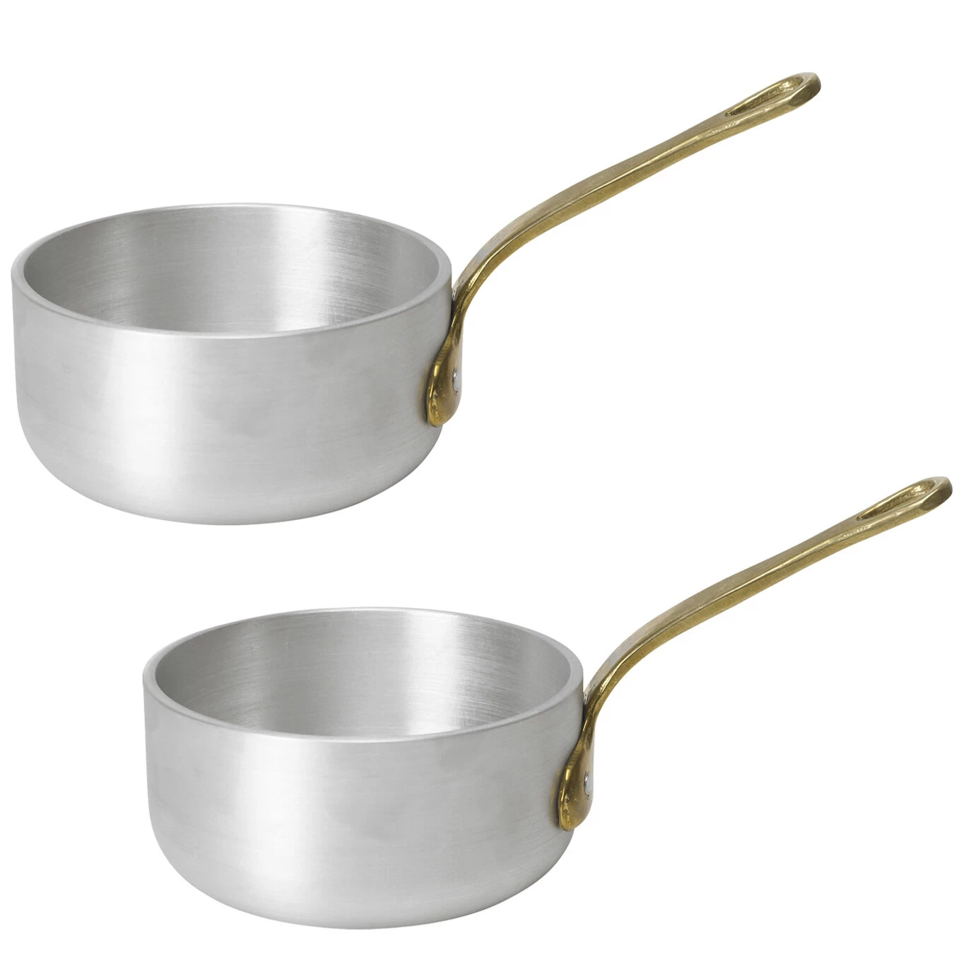 - Piccole pentole in alluminio puro al 99%, 3,5 mm di spessore, esterno in alluminio spazzolato, maniglie in ottone. Made in Italy