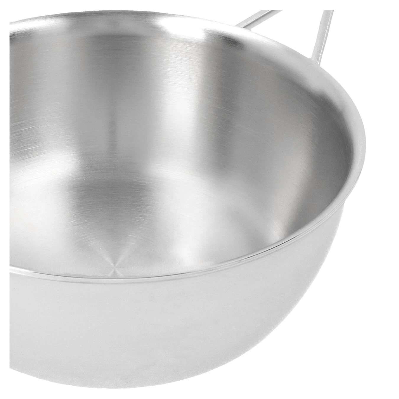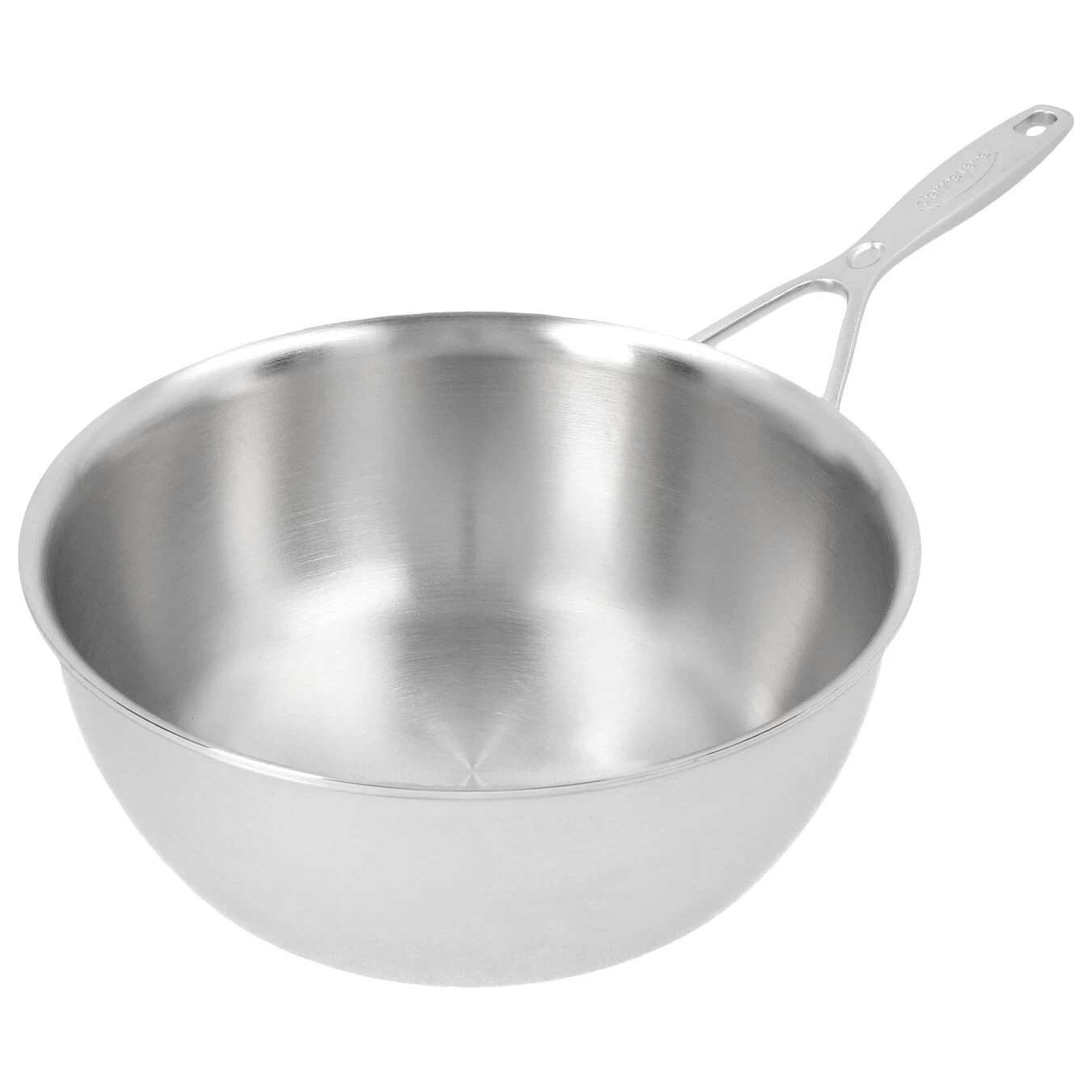 La padella conica per sauté si distingue per la sua forma particolare, che si allarga nella parte superiore. Il diametro della base di 16,5 cm si estende fino a 24 cm sul bordo superiore, consentendovi di utilizzare comodamente una frusta. Ciò significa che si possono mescolare salse cremose o frullare creme e mousse fino a renderle leggere e spumose. La padella conica per sauté è pensata principalmente per la preparazione di salse, ma in questa padella da 24 cm si possono preparare anche altri piatti. La casseruola ha una capacità complessiva di 3,3 litri. Progettata dal designer belga Stefan Schöning, questa pentola della gamma Industry si ispira alle pentole puriste americane. Il design combina un’elevata funzionalità con linee eleganti. La casseruola è realizzata interamente in materiale a 5 strati di alta qualità . Questo materiale è ideale per le pentole per sauté, poiché la combinazione di diversi strati di acciaio inossidabile e alluminio conduce il calore dalla piastra di cottura in modo eccellente e uniforme. Anche le salse più complicate possono essere preparate con successo. È possibile utilizzare questa padella conica per sauté su tutti i tipi di piani di cottura, compresi i piani a induzione. La pulizia è facile e veloce, grazie all’acciaio inossidabile trattato con Silvinox®. La finitura in Silvinox® protegge i vostri nuovi utensili da cucina dallo scolorimento e favorisce la facile rimozione delle impronte digitali, mantenendo al tempo stesso la lucentezza tipica dell’acciaio inossidabile. La padella conica per sauté di Demeyere sarà un pratico accessorio della vostra cucina per molto tempo.