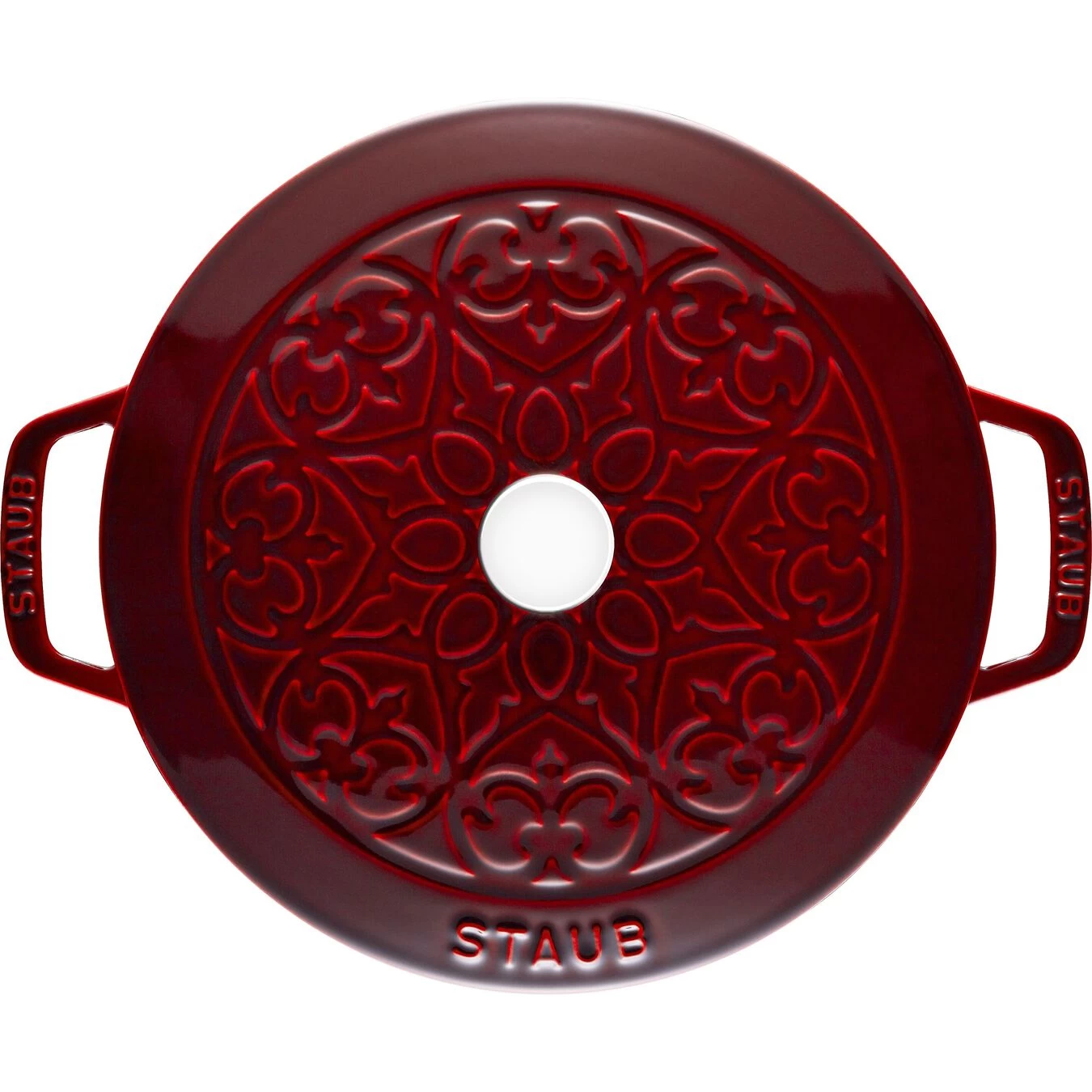 Il forno francese presenta le stesse eccellenti caratteristiche di cottura della Cocotte. La ghisa smaltata distribuisce il calore in modo uniforme per ottenere i migliori risultati e mantiene la temperatura a lungo, in modo che il cibo rimanga caldo per tutto il pasto. La struttura a gocce Chistera crea un effetto Aroma Rain: l’umidità che evapora viene fatta ricadere sul cibo, rendendo la carne tenera ed esaltando il sapore degli ingredienti. Ciò che rende questo forno francese un’aggiunta molto speciale a qualsiasi cucina ben arredata e il regalo perfetto per i buongustai è la possibilità di “disegnare” sul coperchio. Scegliete tra diversi bellissimi motivi, come il giglio, su colori vivaci. Il design squisito fa risaltare il forno francese e aggiunge un tocco interessante alla tavola quando viene usato per servire. Con la sua forma conica e i bordi arrotondati, il forno francese è ideale per tutti i piatti che vengono mescolati spesso, permettendo al cucchiaio di cottura di raggiungere ogni angolo. Provatelo con ricette come il “pilaf di verdure con zafferano e petto di pollo” o un risotto cremoso. Il forno francese è adatto a tutti i tipi di piani cottura e può essere utilizzato anche all’interno del forno, ad esempio per cuocere il pane in una perfetta forma arrotondata. -24 cm di diametro, rotondo, rosso-granata -Coperchio a cupola in edizione artistica -Fusione di ghisa smaltata per un’elevata durata -Manopola in acciaio inox -Adatta a tutti i tipi di piani cottura, anche a induzione e in forno