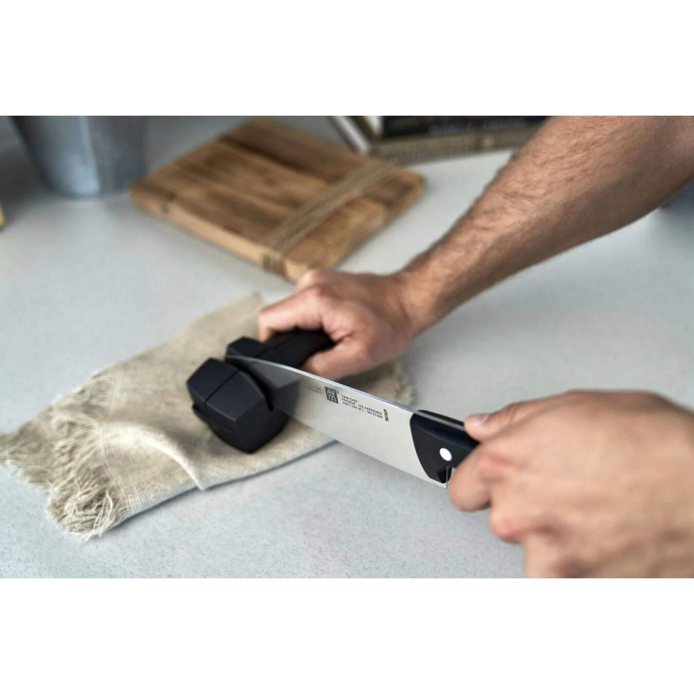 L’affilacoltelli Sharp Pro di ZWILLING rende i coltelli molto affilati, garantendo un taglio fine. Questo pratico utensile fatto di plastica nera è adatto a utenti sia destri, sia mancini. Lo Sharp Pro è anche facile da usare per i cuochi amatoriali. È adatto a ogni tipo di coltello da cucina senza il filo seghettato. Questo pratico utensile diventerà un utile complemento nella vostra cucina e vi consentirà di affilare i vostri coltelli smussati in autonomia. Anche i coltelli in acciaio inossidabile con lame temprate perdono la propria affilatura col tempo. L’affilacoltelli è quindi ideale per ottenere risultati affidabili e precisi. Con l’affilacoltelli ZWILLING i vostri coltelli recupereranno il filo e potranno tagliare senza sforzo pesce, carne, verdure e molti altri ingredienti.
