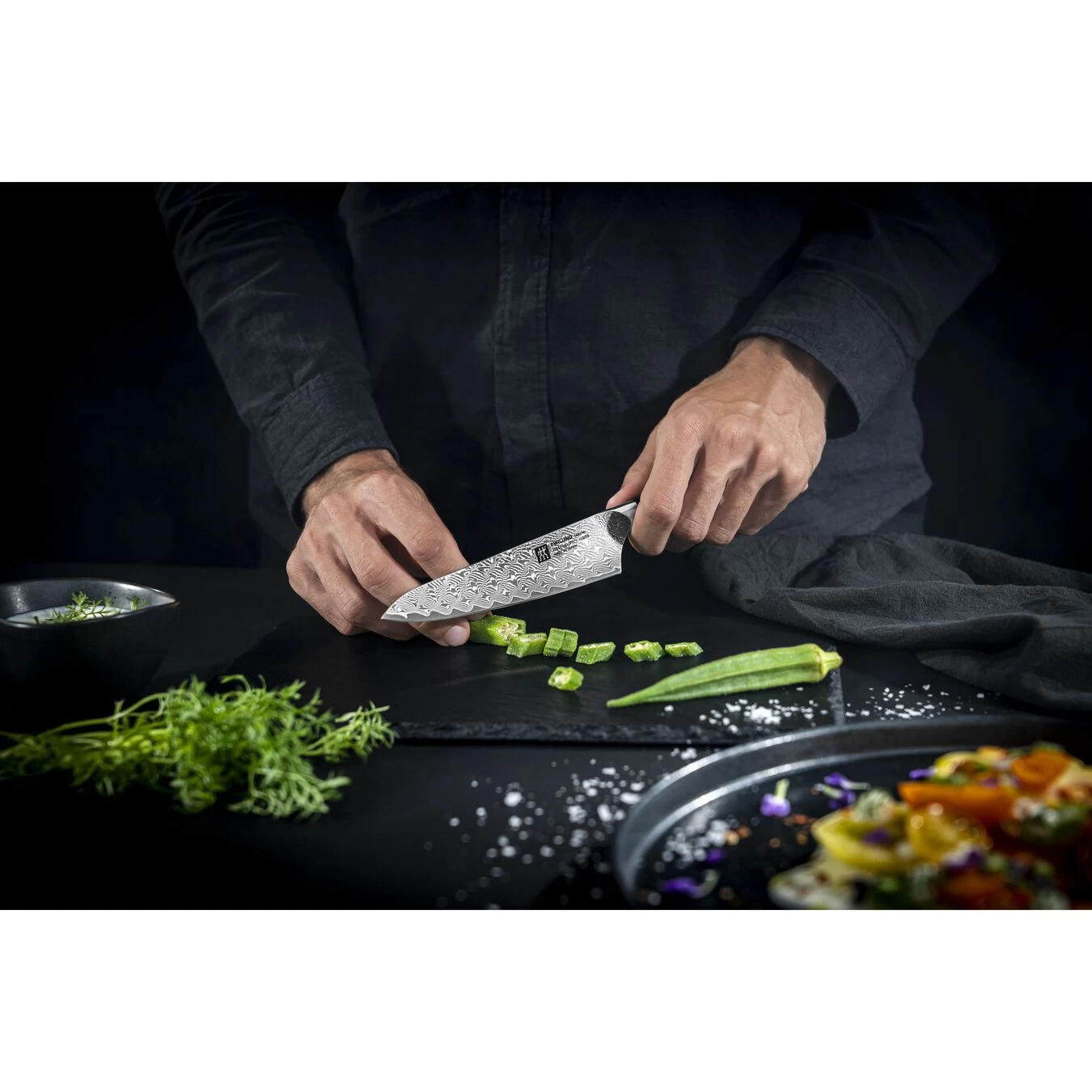 Caratteristiche che devi tenere a mente quando prepari piatti sofisticati, specialmente se ami cucinare e vuoi un vero coltello premium per un uso versatile. Questo coltello da cuoco compatto della serie TAKUMI fa grande uso della lunghezza della sua lama di soli 14 cm, racchiudendo diverse caratteristiche eccezionali in questo piccolo spazio, come una lama di 14 cm, Honbazuke affinata da maestri artigiani e con un piccolo angolo di lama per una precisione ancora maggiore.